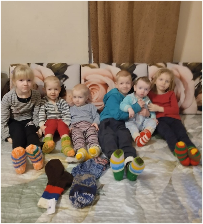 В рамках благотворительного Марафона «Живи ярко - делай добро!» подопечные Новлянского дома-интерната связали своими руками, с любовью в каждой петельке, тёплые носочки для большой и дружной семьи Болотских. Получилось 8 ярких пар носков, которые волонтёры подарили многодетной семье из п. Новлянка. Супруги и шестеро их несовершеннолетних детей обрадовались такому душевному сюрпризу.