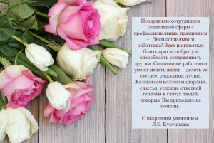 "Поздравляю сотрудников социальной сферы с профессиональным праздником – Днем социального работника! Всех причастных благодарю за доброту и способность сопереживать другим. Социальные работники умеют менять жизнь – делать ее светлее, радостнее, лучше. Желаю всем коллегам здоровья, счастья, успехов, ответной теплоты в глазах людей, которым Вы приходите на помощь.