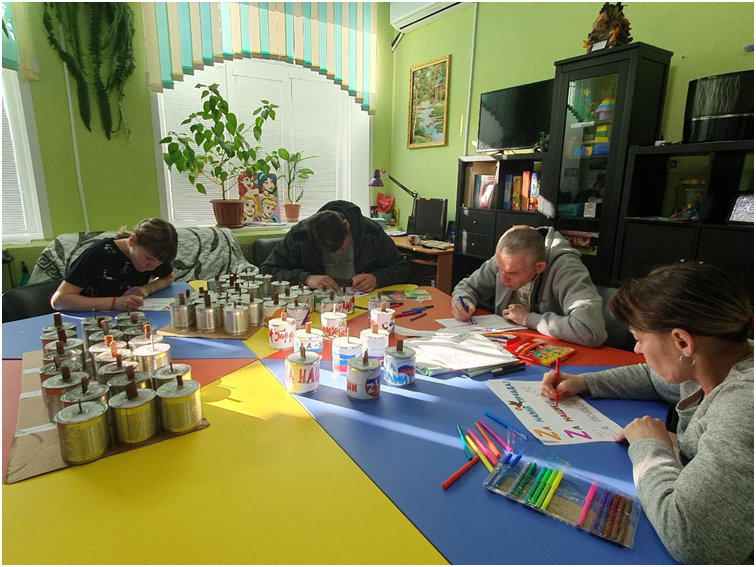Жители интерната делают свечи из жестяных банок и картона, заливают их растопленным парафином, рисуют подбадривающие эмблемы, которые наклеивают на готовое изделие. Каждый вкладывает в этот процесс тепло своей души.