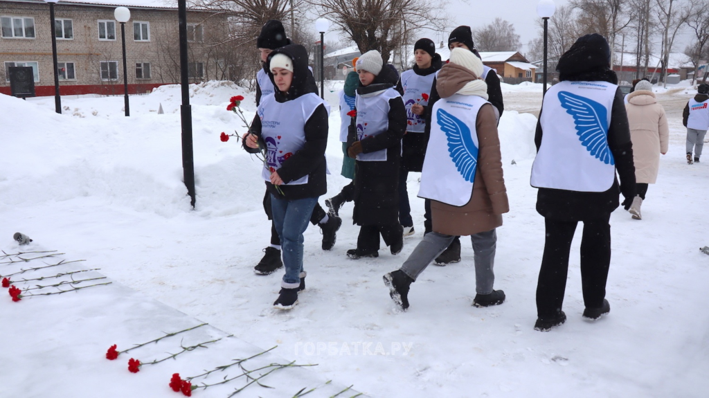 На площади Памяти в Красной Горбатке активисты «Молодой гвардии Единой России» и «Волонтёры Победы» возложили цветы к мемориалу воинам-селивановцам.