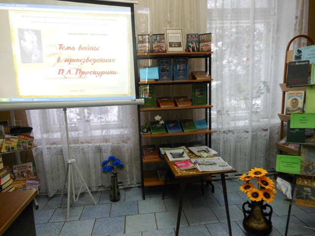 Слайдовый просмотр по произведениям военной тематики: «Глубокие раны», «Исход», «Снова дома», «День смятения», «Цена хлеба», «Судьба», «Имя твое» и другие, не раз прерывался живой дискуссией неравнодушных участников мероприятия. Проскурин показал войну без прикрас, отобразил правду жизни, как бы она не была горька и трагична. Своеобразной визитной карточкой стала знаменитая трилогия о судьбе России: романы «Судьба», «Имя твое», «Отречение». Романы «Судьба» и «»Любовь земная» были экранизированы Евгением Матвеевым. За сценарий кинодилогии Петр Проскурин удостоен звания лауреата Государственной премии СССР и России.