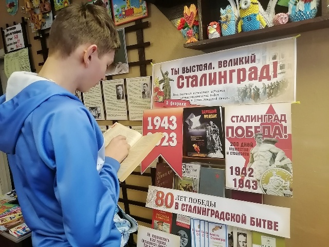 К мероприятию оформлена книжная выставка «Ты выстоял, великий Сталинград», где представлена, как документальная литература о Сталинградской битве, так и художественная литература: С. А. Алексеев «Рассказы о Великой Отечественной войне», В. Некрасов «В окопах Сталинграда», Ю. Бондарев «Горячий снег», К. Симонов» Живые и мёртвые» и другие.