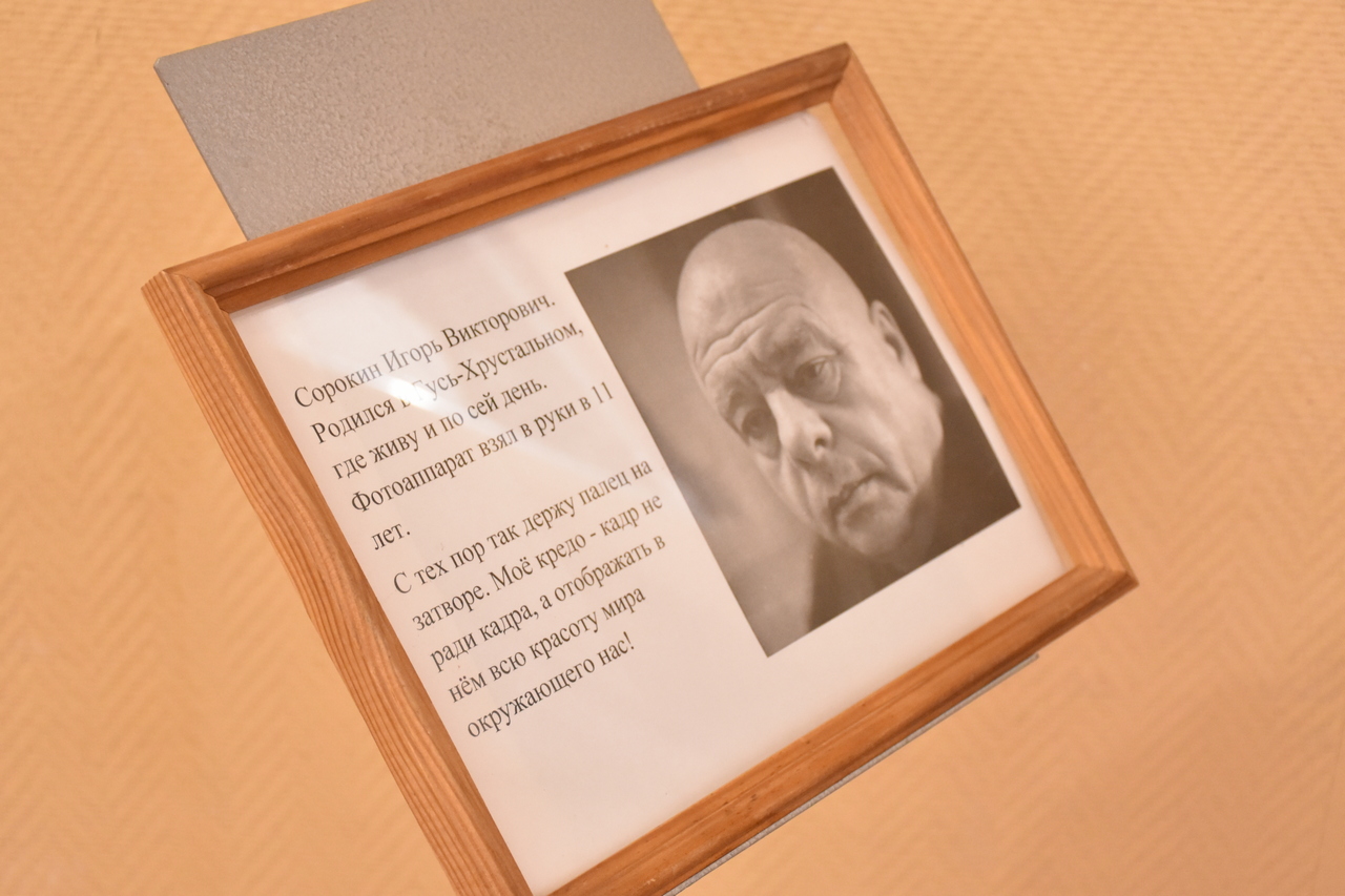 «Родился в Гусь-Хрустальном, где живу и по сей день. Фотоаппарат взял в руки в 11 лет, с тех пор держу палец на затворе. Мое кредо – кадр не ради кадра, а отображать в нем всю красоту окружающего нас мира», - сказано о фотохудожнике на информационном стенде в музее.