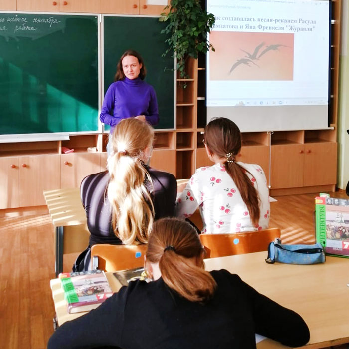 Главным событием стало чтение стихотворений поэта. Учениками школы по ролям было прочитано стихотворение «Откуда ты, молодость?» Особенное внимание было привлечено к песне «Журавли», написанной на стихи Расула Гамзатова. Библиотекарь рассказала историю создания песни, все вместе ещё раз вспомнили, как она звучит, прослушав аудиозапись. Школьникам была представлена краткая биография поэта, его вклад в мировую литературу и национальную культуру.