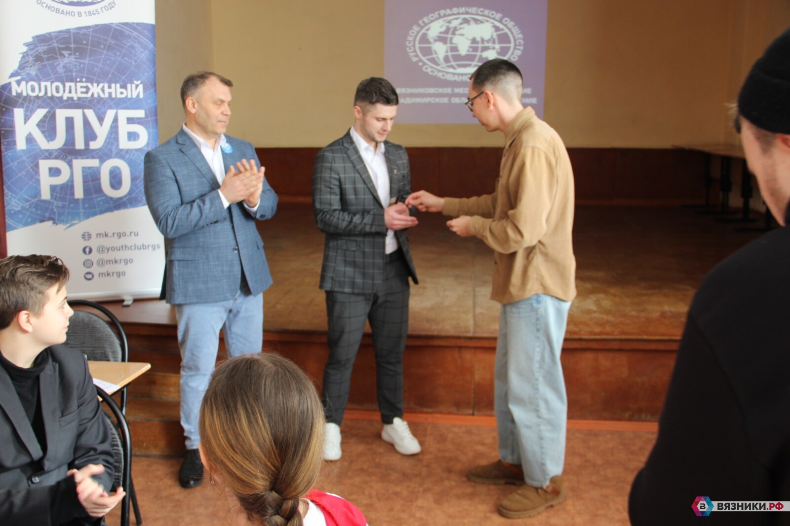 Начиная с нынешнего года, в Вязниках существует собственное отделение Русского географического общества. На днях его председатель – учитель географии СОШ №2 Дмитрий Киселёв, и секретарь – учитель географии Пирово-Городищенской школы Константин Шишов в торжественной обстановке получили свои первые членские билеты.