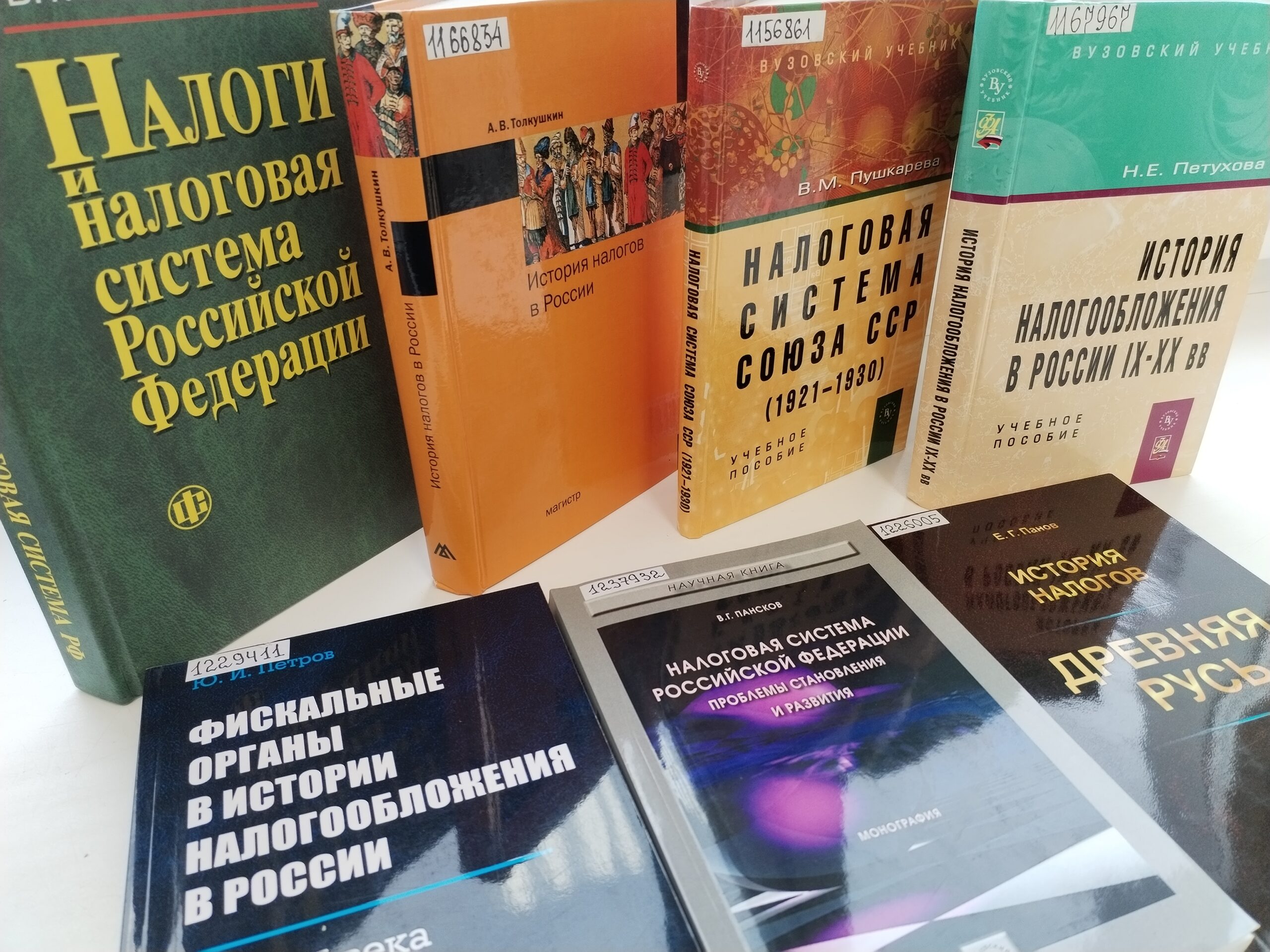 Эволюция налоговой системы России в различные исторические эпохи представлена в книге А. В. Толкушкина История налогов в России (2011) . Даётся характеристика основных видов налогов, пошлин, сборов и других платежей обязательного характера в различные исторические эпохи с Древней Руси до 2000 г. Также раскрывается содержание важнейших налоговых реформ.В начале XVIII века сделано многое по созданию налоговой системы. Были изданы указы о сборе налогов в годы правления императора Петра I. Учреждены 4 коллегии, которые ведали финансами, например, пошлинами и сборами. В 1718 году создано отдельное ведомство, которое занималось сметами государственных расходов. А в 1724 году введен подушный налог, которым облагались мужчины податных сословий. Налог предназначался для содержания армии и составлял около 50% всех доходов в бюджете государства. Также взимался оброчный сбор с крестьян за пользование землёй.