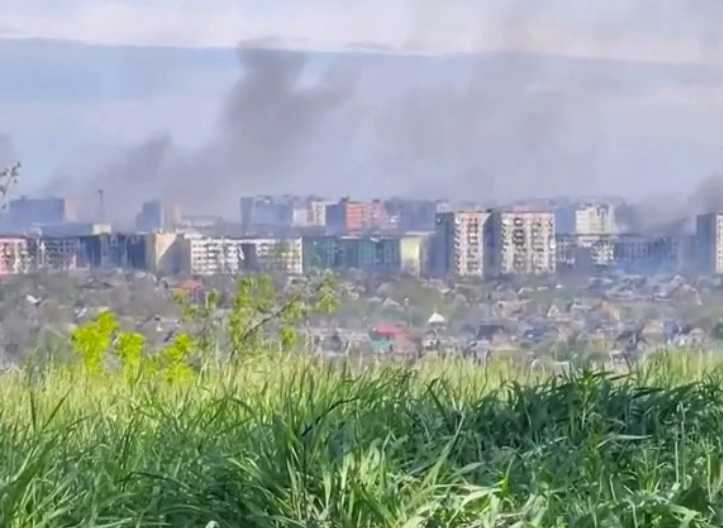 На видео можно видеть столбы дыма, что свидетельствует о непрерывных артиллерийских обстрелах со стороны украинской армии в районе Бахмута.