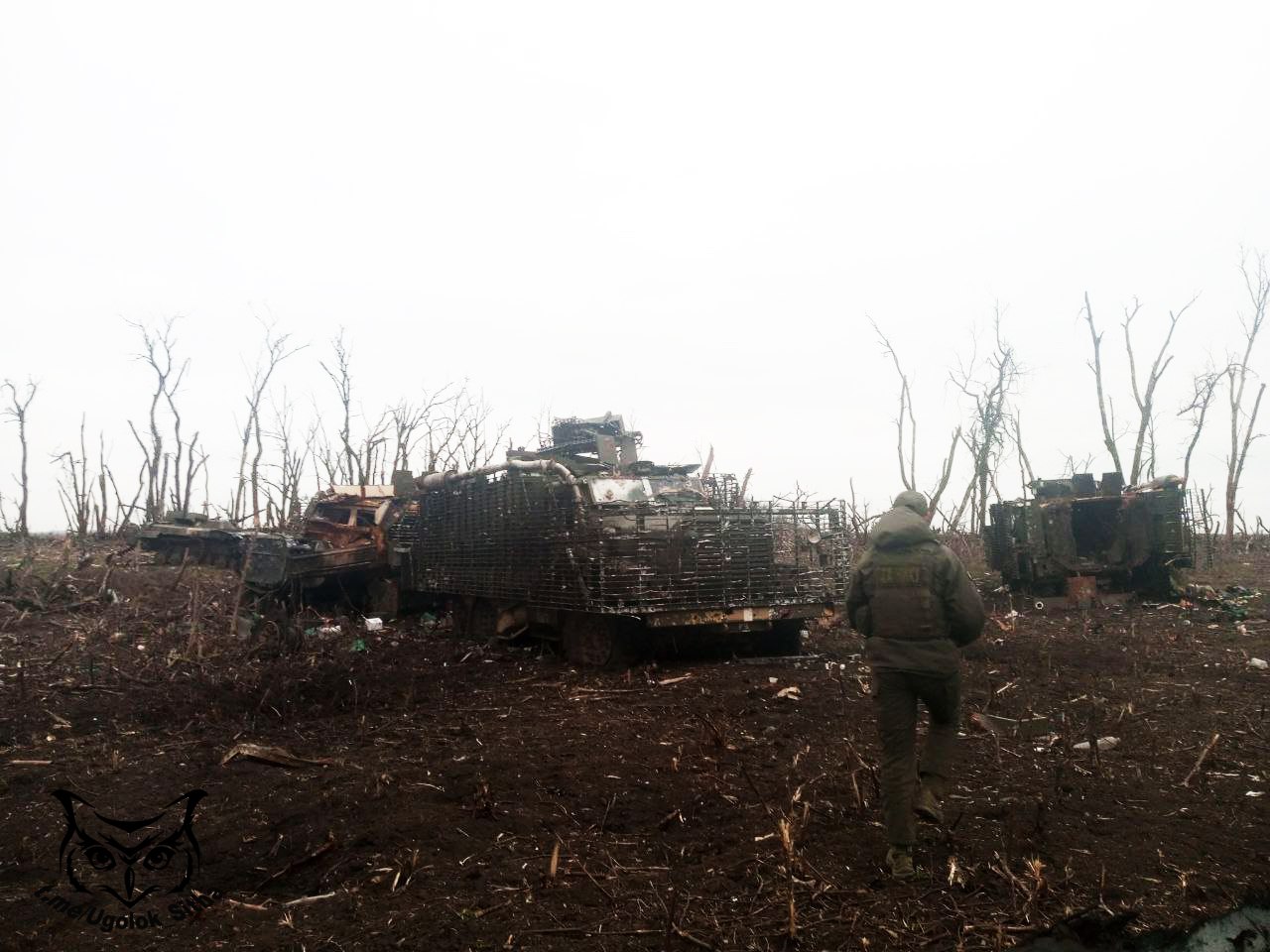 Фото: ТГ-канал “Военкоры Русской весны”На них показаны три натовских бронированных автомобиля MRAP, оснащенных решетками против ПТУР, а также БМП.