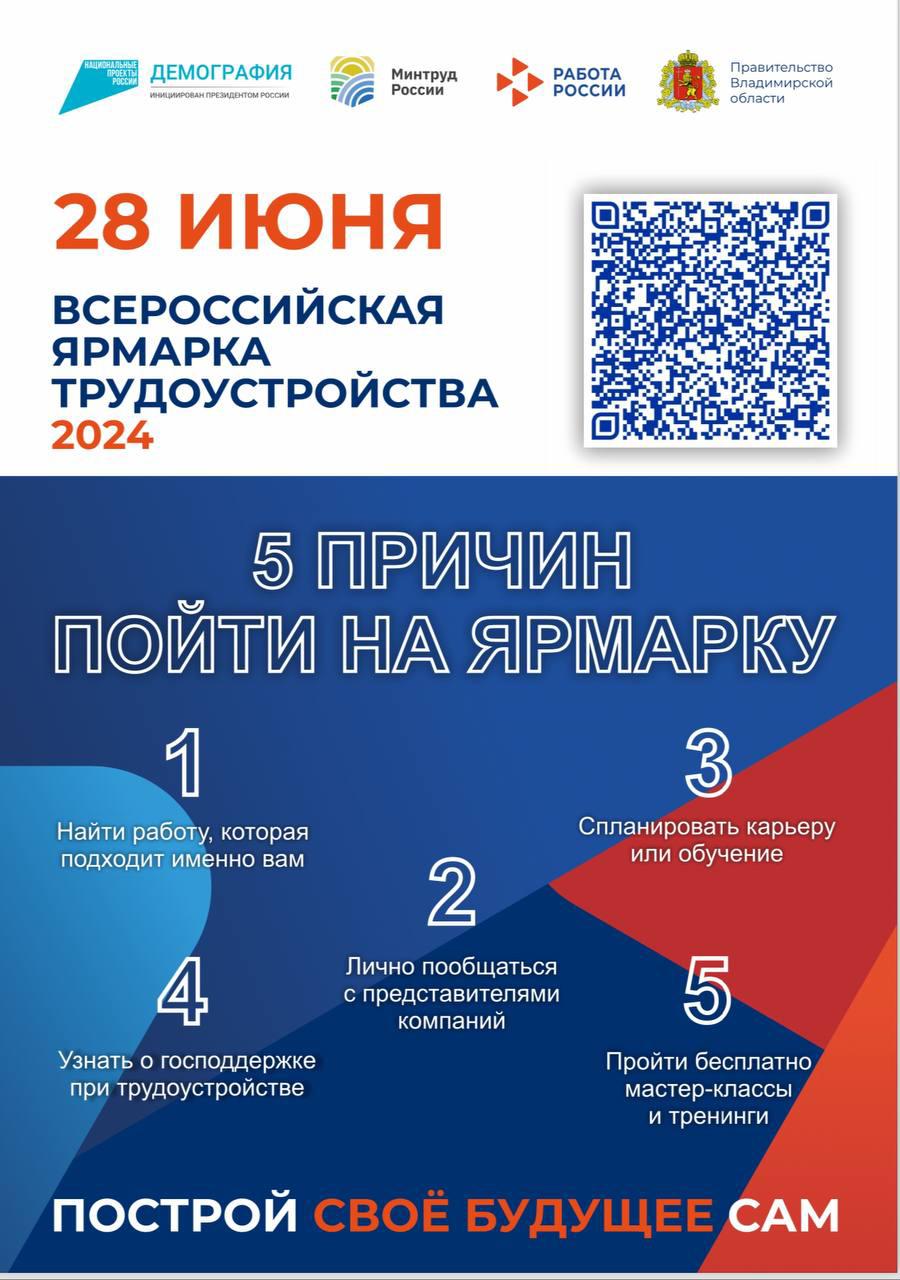 Не упустите шанс открыть для себя новые возможности, познакомиться с единомышленниками и найти работу своей мечты. Ждем вас 28 июня во Владимирской области на федеральном этапе Всероссийской ярмарки трудоустройства «Работа России. Время возможностей»!