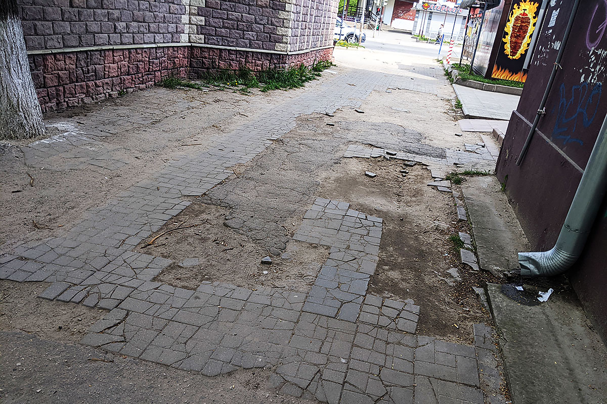 Пешеходный проход от магазина «Ярче» к киоску «Роспечати» (у территории сквера) тоже весь разбитый. И это центр города! Лето на подходе, хочется в летней обуви походить, а как мы знаем, какие у летней обуви тонкие подошвы. Рекомендации для администрации — хоть изредка ходить по городу пешком, чтобы оценить качество жизни людей в городе».