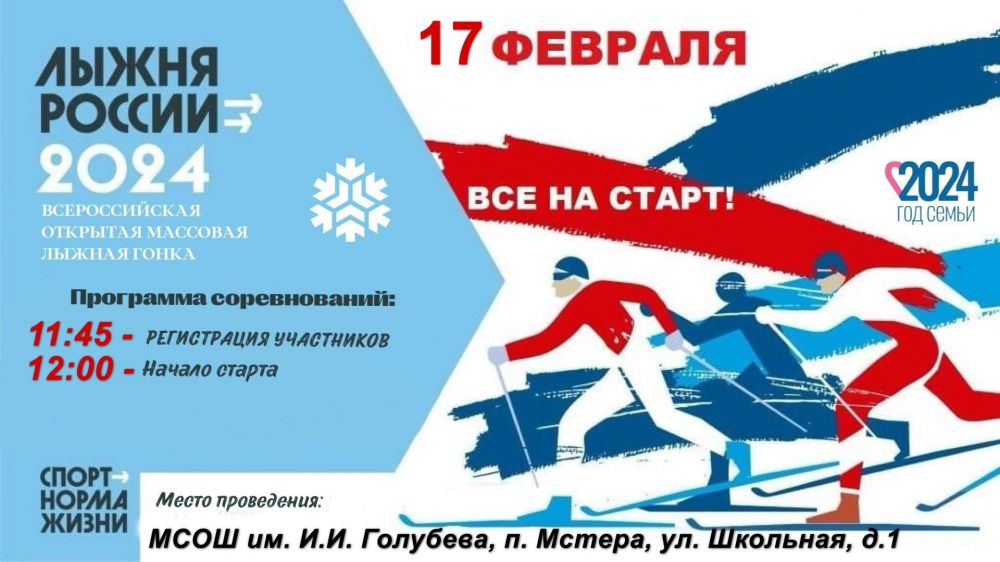 17 февраля в п. Мстера состоится открытая массовая лыжная гонка "Лыжня России 2024".