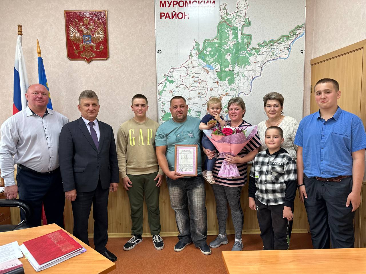 Сегодня Глава района Ирина Абрамова, Глава администрации Николай Муравьёв, и.о. Главы администрации МО Борисоглебское Дмитрий Большов вручили многодетной семье Туркиных из деревни Степаньково свидетельство о праве на получение социальной выплаты на строительство индивидуального жилого дома или приобретение жилого помещения.