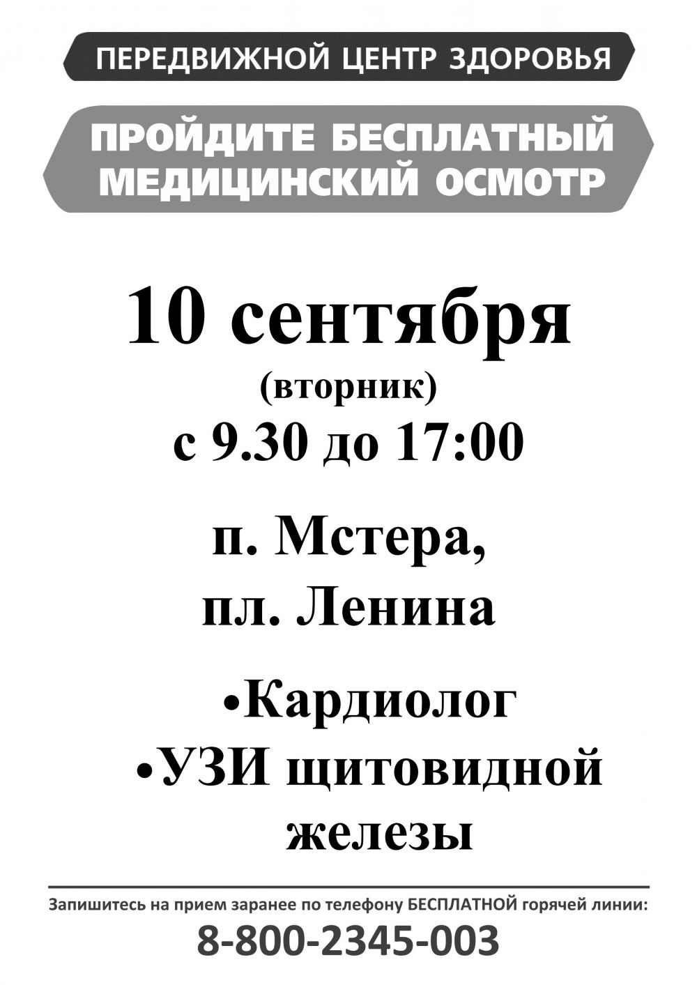 В п. Мстера, на площади Ленина, пройдет бесплатный медицинский осмотр для всех желающих. В рамках мероприятия будут доступны следующие услуги: