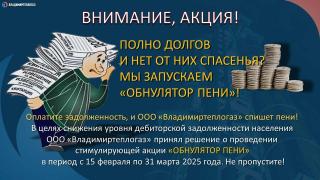 ООО «Владимиртеплогаз» с 15.02.2025 по 30.03.2025 проводит стимулирующую акцию «ОБНУЛЯТОР ПЕНИ».
