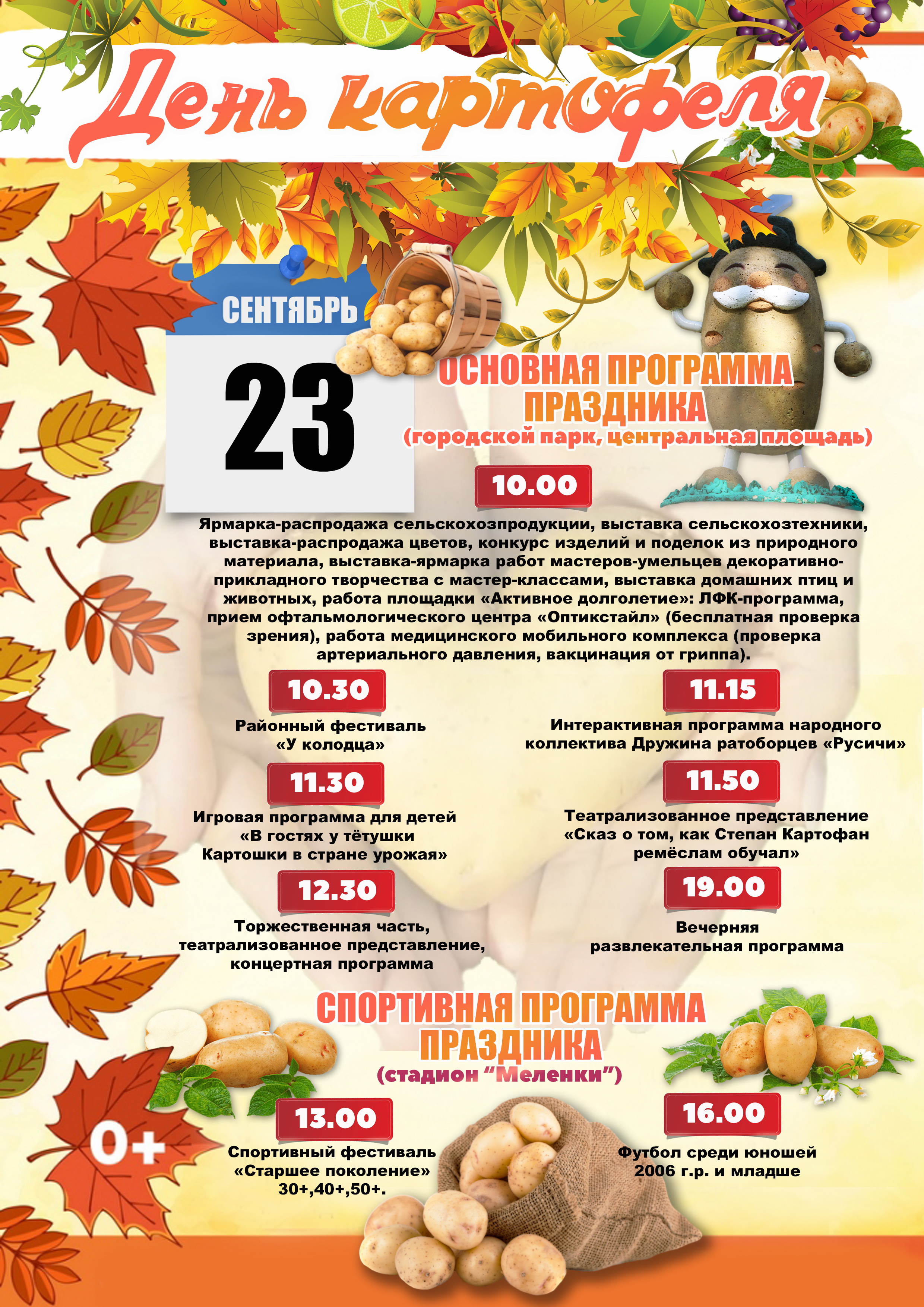 Как обычно, местом проведения основной части праздника станут центральная площадь и городской парк, где можно будет увидеть сельхозтехнику, на которой работают наши производители, принять участие в ярмарке и различных конкурсах, увидеть театрализованные представления, изумительные поделки мастеров-умельцев и многое другое. Все желающие в этот день смогут приобрести также товары практически всего ассортимента продукции, выпускаемой нашими сельхозпроизводителями и перерабатывающими предприятиями, включая, конечно же, картофель. Для старшего возраста будет работать площадка "Активное долголетие". Программа праздника включает в себя: 10.00 - Ярмарка-распродажа сельскохозяйственной продукции «Дары полей, садов и огородов» 10.00 - Агровыставка сельскохозяйственной техники и семеноводства «Из прошлого к будущему» 10.00 - Выставка-распродажа цветов 10.00 - Конкурс изделий и поделок из природного материала «Осенние фантазии» 10.00 - Выставка-ярмарка работ мастеров-умельцев декоративно-прикладного творчества «Родного края дивные узоры», мастер-классы 10.00 - Выставка домашних птиц и животных «Сельское подворье» 10.00 - Распродажа продукции сельхозпредприятий района «Урожай-2023» 10.00 - Работа площадки «Активное долголетие»: - ЛФК-программа - прием офтальмологического центра «Оптикстайл» (бесплатная проверка зрения) - работа медицинского мобильного комплекса (проверка артериального давления, вакцинация от гриппа ) 10.30 - Районный фестиваль «У колодца» 11.15 - Интерактивная программа народного коллектива Дружина ратоборцев «Русичи» 11.30 - Игровая программа для детей «В гостях у тётушки Картошки в стране урожая» 11.30 - Гастрономический фестиваль «Меленковский разгуляй» 11.50 - Театрализованное представление «Сказ о том, как Степан Картофан ремёслам обучал» 12.30 - Торжественная часть Праздника Картофеля. Театрализованное представление. Концертная программа 19.00 - Вечерняя развлекательная программа артистов и творческих коллективов Владимирской области Предусмотрена и отдельная спортивная программа, которая пройдет на стадионе "Меленки". 13.00 - Спортивный фестиваль «Старшее поколение» 30+,40+,50+ 16.00 - Футбол среди юношей 2006 г.р. и младшеПоследние новости