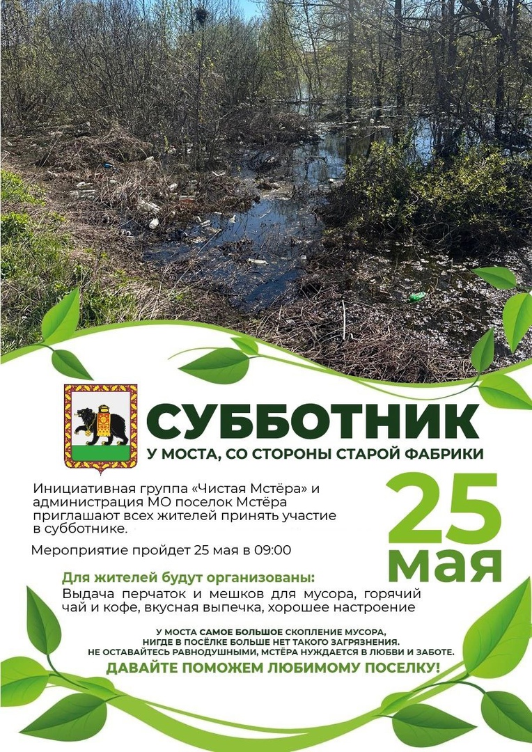 Инициативная группа "Чистая Мстера" и администрация муниципального образования поселок Мстера приглашает всех жителей принять участие в субботнике 25 мая в 09:00 у моста через р. Мстерка,