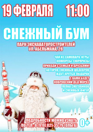 Любой желающий сможет поучаствовать в конкурсе снежных фигур или посмотреть творения «снежных строителей». Организаторы – Отдел молодежной политики МКУ города Коврова «Управление культуры и молодежной политики» приглашают как индивидуальных участников, так и пары или целые команды. Регистрация будет вестись по 18 февраля включительно. Для регистрации достаточно позвонить по номеру 89190213579 или написать сообщение с названием команды, количеством участников в ней и телефоном для связи в группе https://vk.com/snezhboom , где можно узнать подробную информацию о конкурсе.