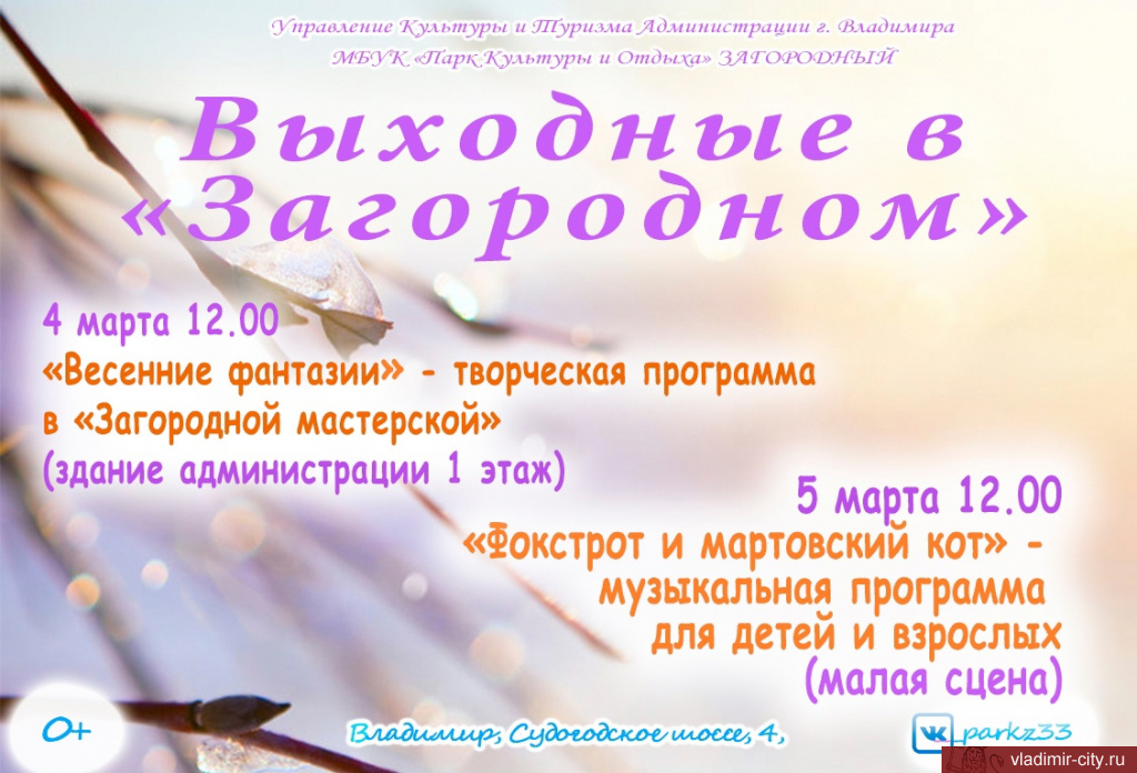 В парке «Загородный» 4 марта в 12.00 начнется творческая программа «Весенние фантазии». Гостей приглашают в «Загородную мастерскую», которая расположена на 1 этаже здания администрации. В воскресенье на малой сцене парка пройдет музыкальная программа для детей и взрослых «Фокстрот и мартовский кот». Начало в 12.00.