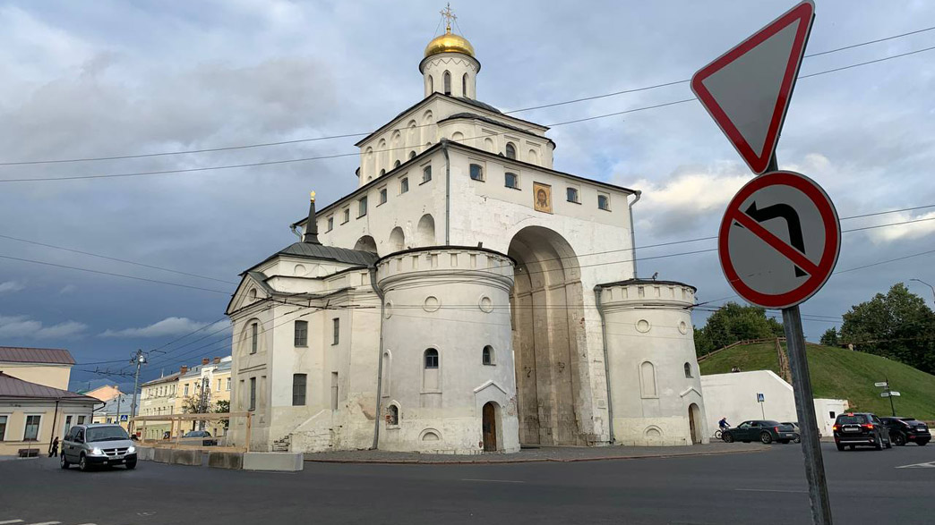 А вот со стороны корпуса ВлГУ бетонные балки частично закрыли прилегающую к Золотым воротам проезжую часть — и это, в общем-то понятно, тротуара там почти нет. Вечерний час-пик уже прошел, несмотря на перекрытие, машины и общественный транспорт едут в сторону Студеной горы и сворачивают вниз на улицу Никитскую без затруднений. Но что будет завтра утром — сказать сложно.