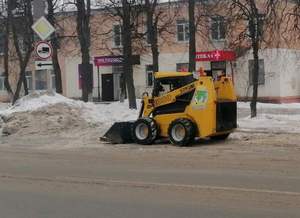 Осуществляется очистка от снега тротуаров и остановочных пунктов на ул. Сосновой, ул. Пионерсой, ул. Киркижа, ул. Колхозной, ул. Куйбышева, ул. Димитрова. Работает погрузчик.