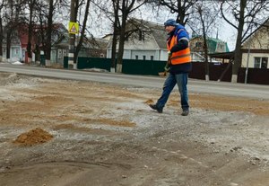 2 КДМ, АНТ-1000 и 2 трактора проводят мониторинг асфальтового покрытия городских улиц и обрабатывают песко-соляной смесью опасные участки дорог.