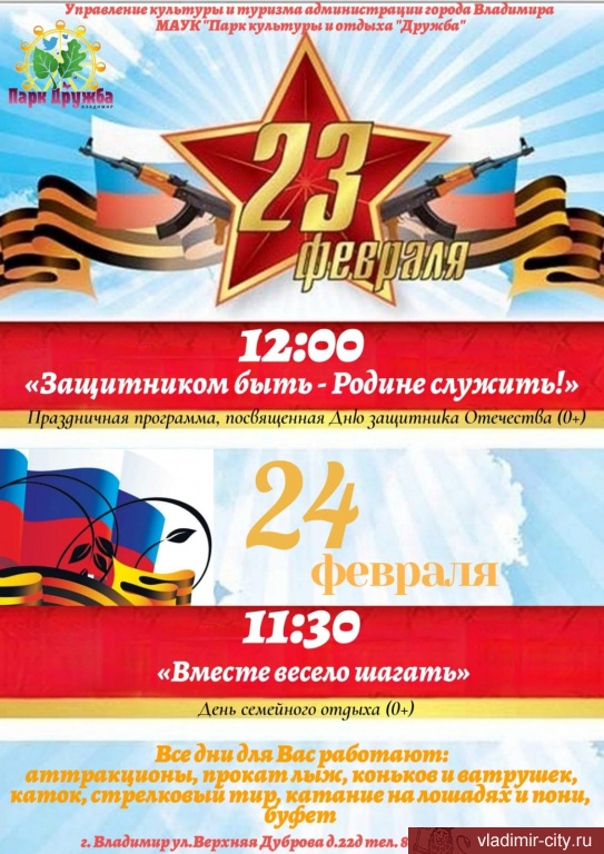 Владимирские муниципальные парки подготовили программы, посвященные Дню защитника Отечества. 23 февраля в 12.00 парк «Дружба» приглашает на программу «Защитником быть - Родине служить!». А 24 февраля в парке «Дружба» пройдет день семейного отдыха - в 11.30 начнётся программа «Вместе весело шагать».