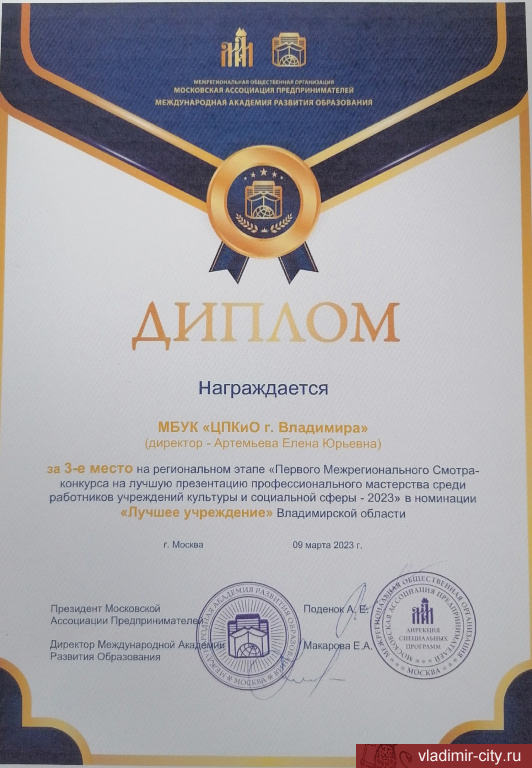 Команда муниципального Центрального парка культуры и отдыха города Владимира приняла участие в «Первом Межрегиональном смотре-конкурсе на лучшую презентацию профессионального мастерства среди работников учреждений культуры и социальной сферы-2023» в номинации «Лучшее учреждение Владимирской области».