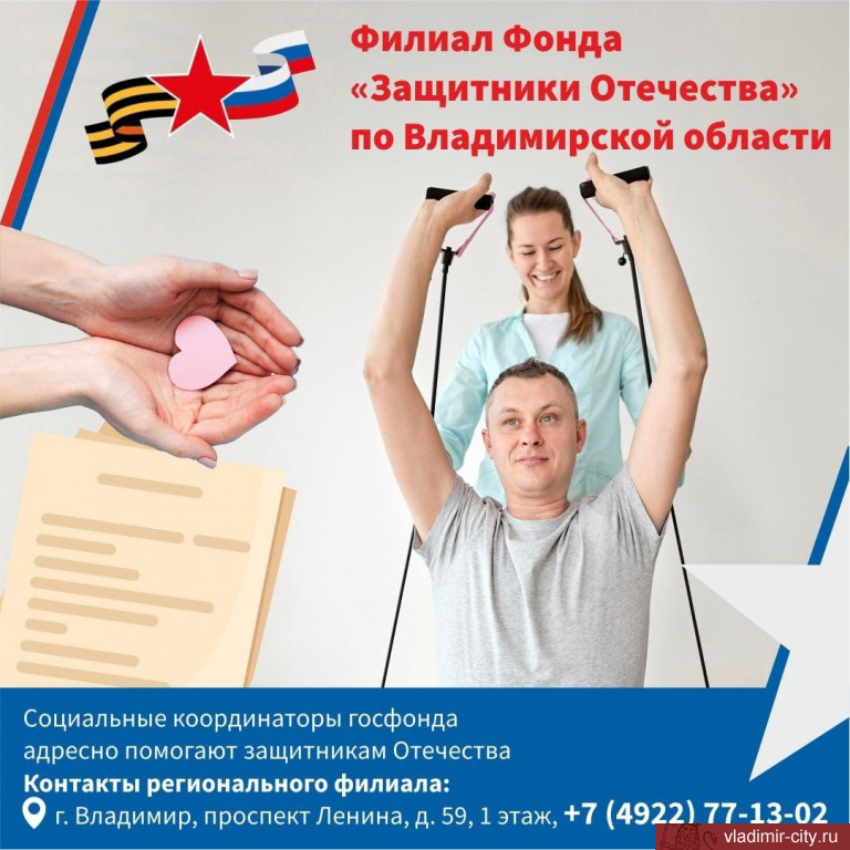 Филиал государственного фонда «Защитники Отечества» по Владимирской области работает во Владимире по адресу: пр. Ленина, 59, 1 этаж. Контактный телефон: ☎️+7 (4922) 77-13-02.