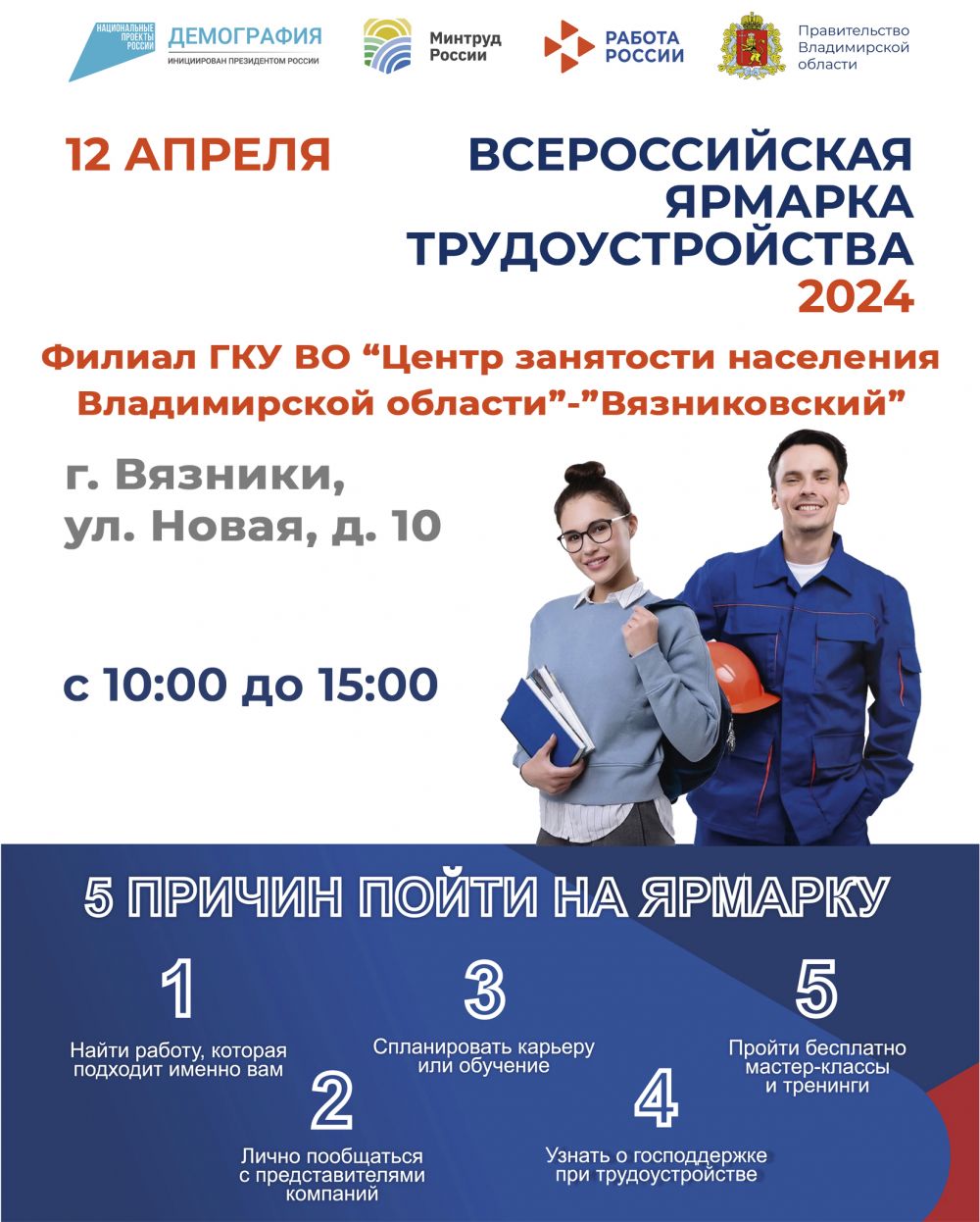 12 апреля 2024 года в Вязниковском районе пройдет Всероссийская ярмарка трудоустройства