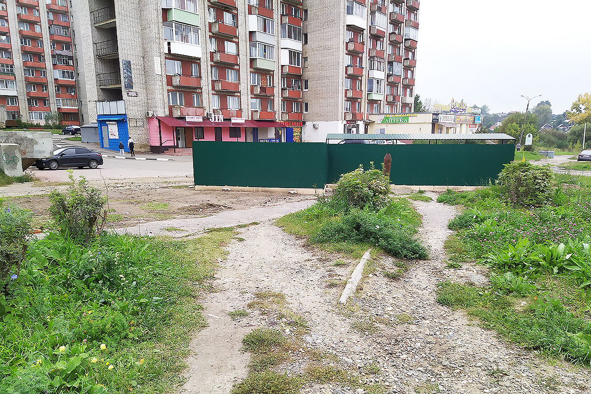 Поток людей проходит вниз к улице Добровольского, где тоже находится большое количество магазинов, стоматология, аптека. Вот как выглядит это место сейчас. Аккуратных дорожек больше нет. Сейчас они выглядят как после обстрела. А если развернуться на 180 градусов, то можно заметить, что в некоторых местах дорожки вообще уничтожены. Прямо поперек двух дорожек поставили помойку.