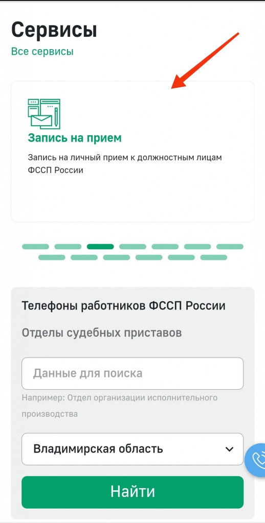 Записаться на личный приём можно с помощью сервиса «Запись на прием» ( https://r33.fssp.gov.ru/fssponline/ ), который работает в режиме онлайн и осуществляет запись посредством авторизации по ЕСИА лиц, зарегистрированных на Едином портале государственных услуг. Предварительная запись осуществляется на период не более 30 дней со дня, следующего за текущим.