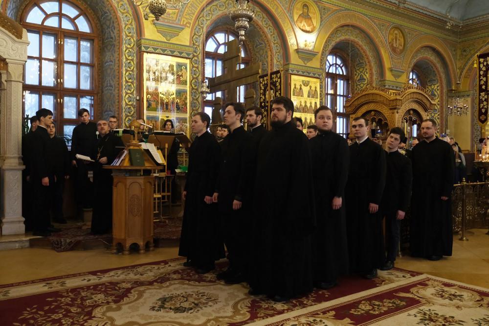 Богослужение совершалось в сопровождении пения Архиерейского хора под управлением регента Татьяны Оганян и хора семинаристов под управлением протоиерея Стахия Нецветаева.